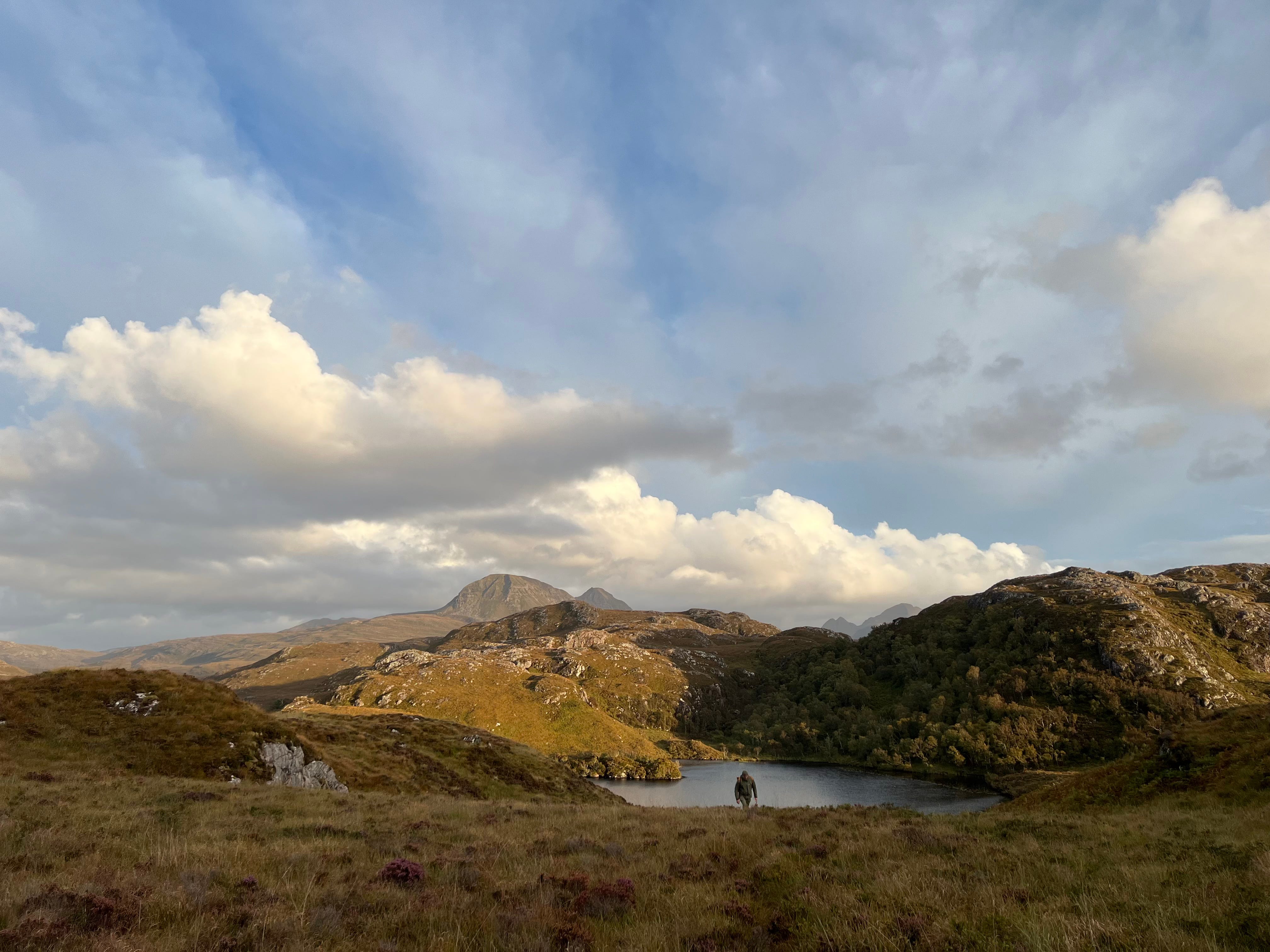 We reach a sheltered corner of Loch na Doire Bige. The wind that carried through the last shower has dropped and the sun offers a little early evening warmth. Birch and rowan trees stand around lily pads. The water is still. Here, higher up, more of the leaves have turned yellow. The last of the low light is golden and the clouds have now lifted from the Torridon Hills. I cast my lone fly into a gap at the edge of the lilies and wait.